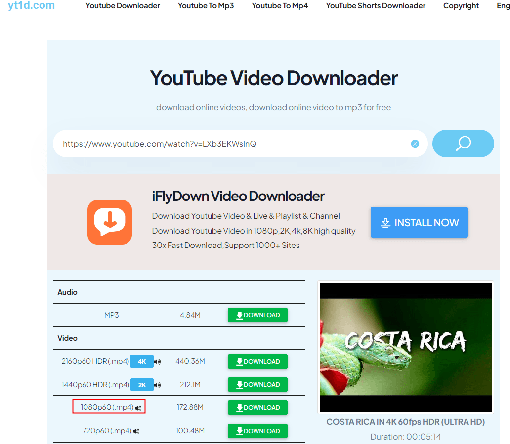 Yt1d is a safe, easy, fast YouTube 1080P video downloader that empowers you to download HD, 720p, 1080P, 4K high-quality music & movie videos from YouTube.