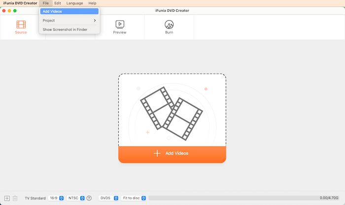iFunia DVD Creator supports 200+ video formats input, there are 3 ways to add video files: