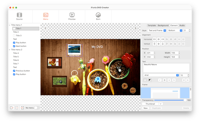 Navigate to Menu tab on the top, If chapters are included in a title, you can see a check box before that title, check the box, you will be able to add and edit menu for those chapters as well. Tips: If you just want a DVD without a menu, you can directly slide on the option