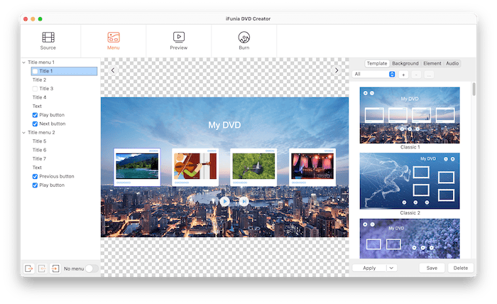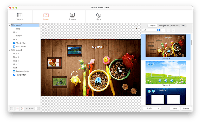 To customize the DVD menu, highlight the target Title Menu, Title, Chapter Menu, or Chapter, then select your preferred template, background, elements, and audio from the right panel.