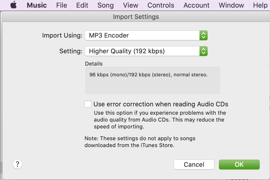 Step 3. In the settings window, Choose “MP3 Encoder” for Import Using, and select the audio quality from Setting. You can choose the higher quality of 192 kbps, then click “OK” to save the settings.
