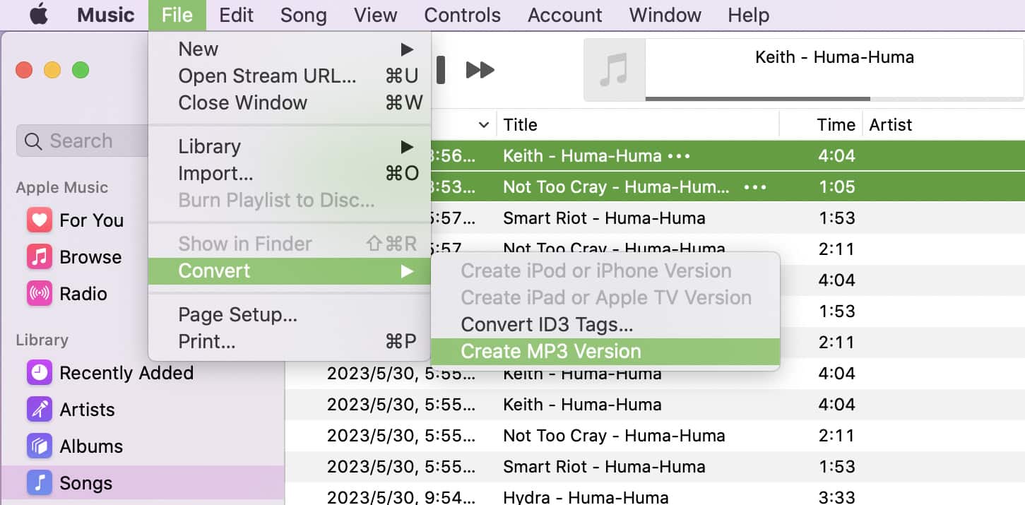 Step 4. Import the M4A file(s) into Music app. Select it in library, click File from the menu bar > Convert > Create MP3 Version. Then the converted MP3 file(s) will appear in your Music library.