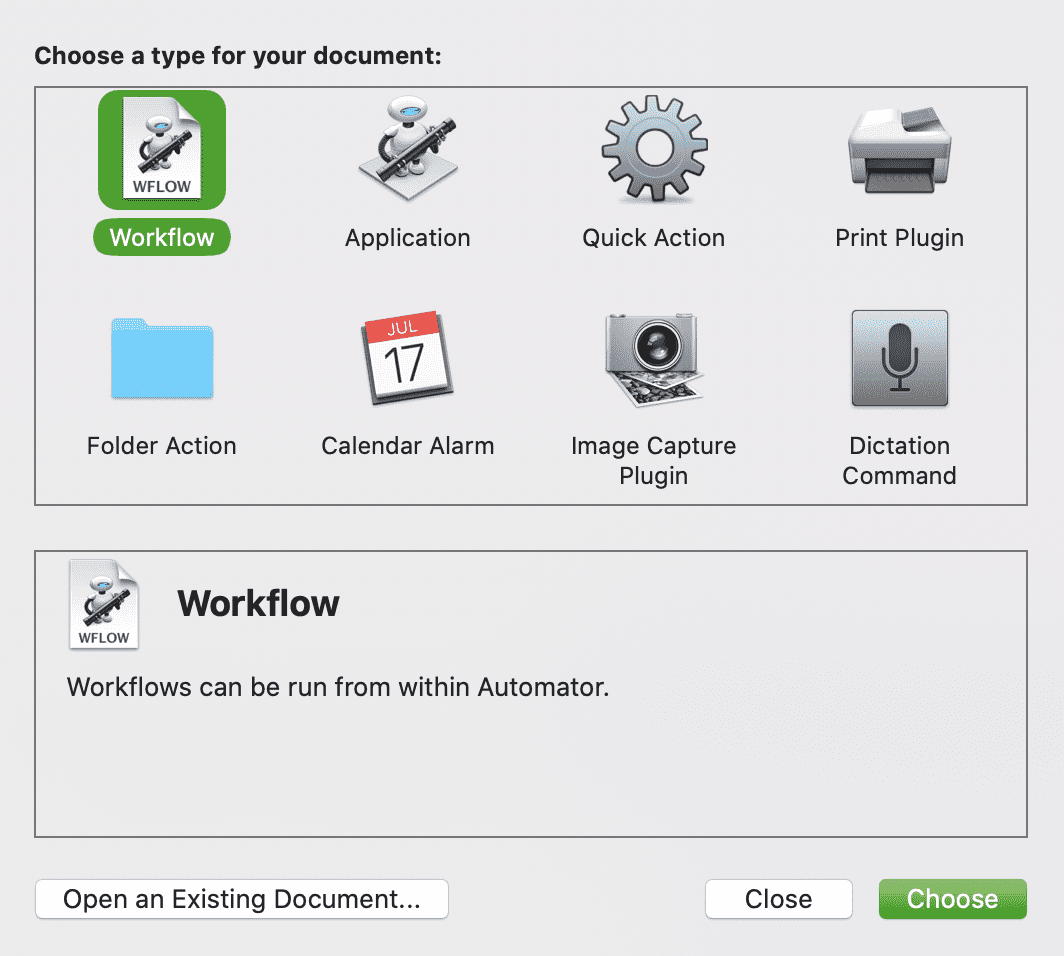Step 1. Open Automator on your Mac, select Workflow to create a new workflow that can run within Automator, click Choose.