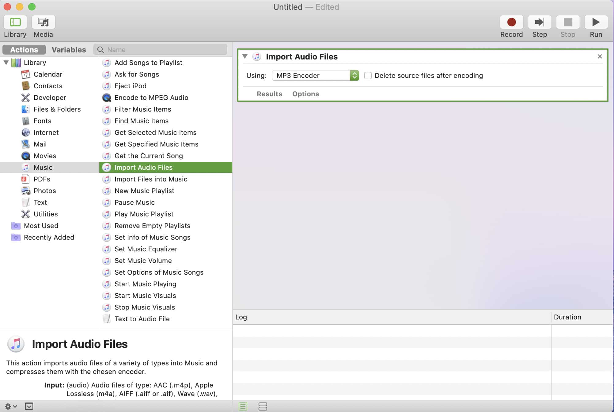 In the Library column on the left, choose “Music” category > double-click “Import Audio Files” to add it to the workflow > select “MP3 Encoder” from the Using menu.