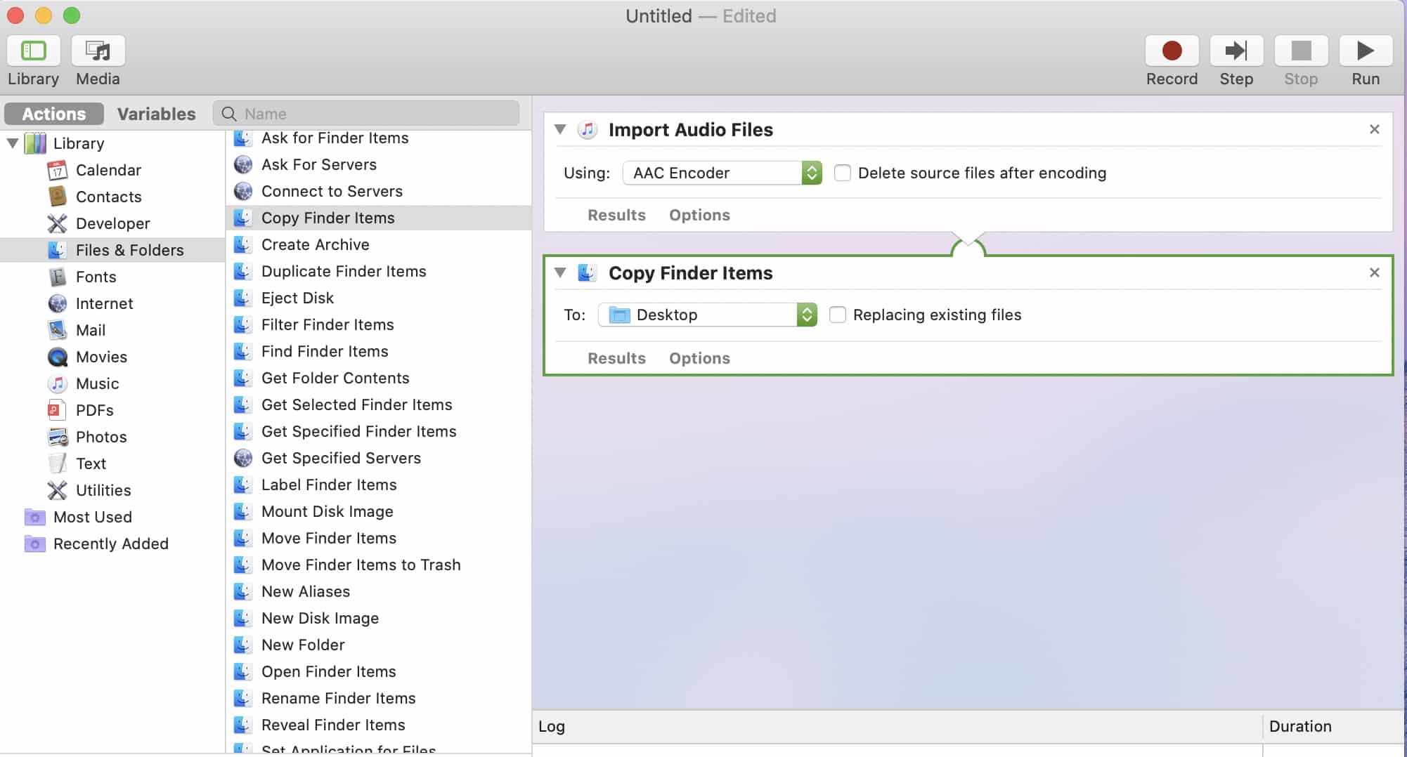 Then select “Files & Folders” category > select and double-click “Copy Finder Items” to add it to the workflow. This action can save your converted MP3 files to the desktop or any other location you specify.
