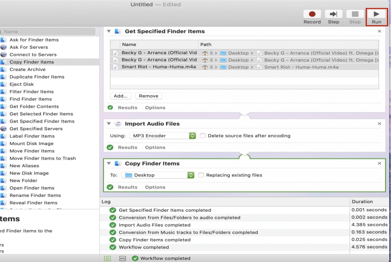 Step 3. Drag the M4A files you want to convert to the front of the actions, then click the “Run” button to start converting to MP3 in the workflow. You can check the Log at the bottom of the window to see if the workflow’s been completed successfully.