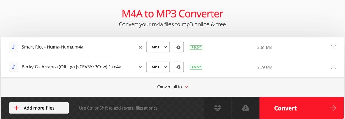 Step 2. Add files (under 100mb). Drag and drop your M4A files or input from Dropbox and Google Drive.