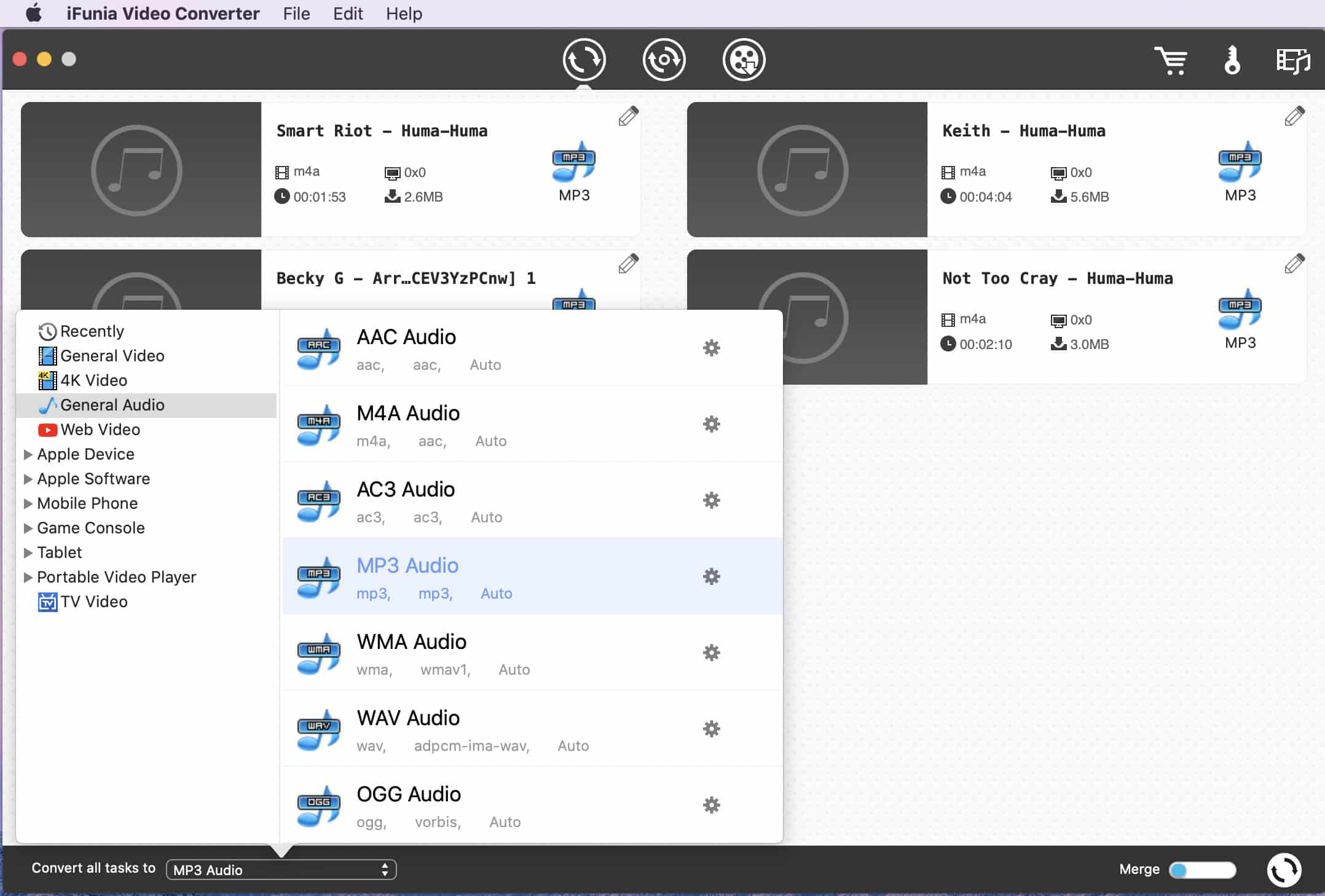 Click “Convert all tasks to” drop-down list on the bottom of the window > select “General Audio” > choose “MP3 Audio” as the output format. You can also set different formats for each file by clicking the Format icon of each file.