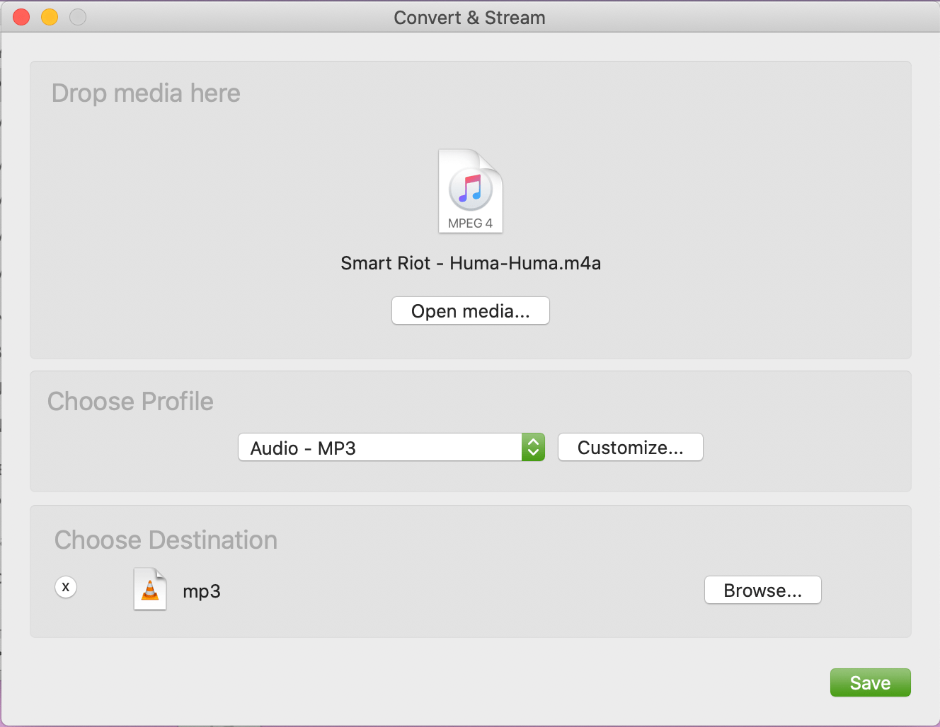 If you have VLC media player on your Mac, you can use its conversion function to convert M4A to MP3 on Mac. However, it can only convert one at a time, not in a batch process.