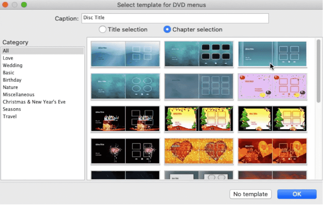 Select a template for the DVD menu, which often includes a title menu and a chapter menu. Click OK to continue.