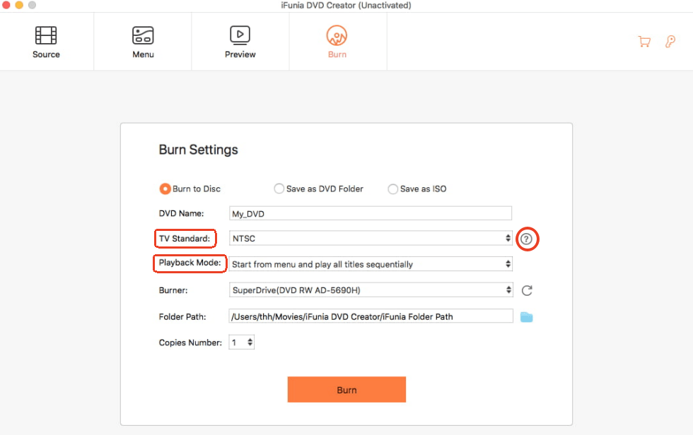 Finally, switch to the Burn tab to configure the burning settings. Enter a DVD name, choose the TV standard (hit on the question mark if you have no idea) and playback mode, insert a blank DVD disc and define it as the Burner.