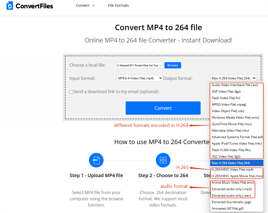Online converters is an ideal option thanks to their conveniency and no installation of any software. I discovered a good MP4 to H264 converter online - ConvertFiles that can convert MP4 to raw H264 and H.264 in other formats, such as 3GP, FLV, MOV, MKV.