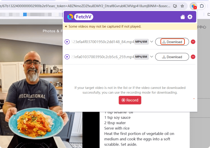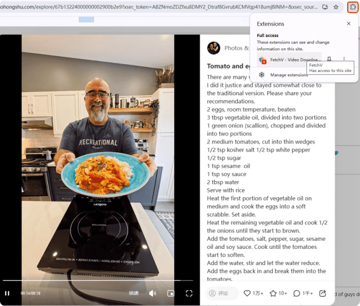- Navigate to the Rednote video you want to download and play it. Tap on the extension icon from the upper menu bar and you’ll find FetchV with a red number 1 (sometimes number 2, if there’s not, refresh the page and try again), click on it.