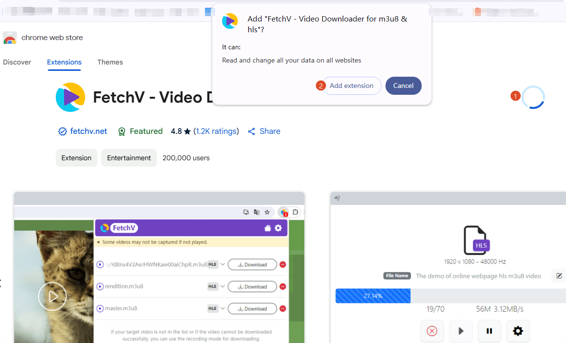 Without downloading any software, extensions integrates directly into your browser for video quick downloads, and don’t require link copy & paste. The extension recommended for Xiaohongshu download video is FetchV, which is compatible with Chrome, Edge, and other Chromium-based browsers. With FetchV, you can download various types of online videos, including M3U8, MP4, WebM and more.