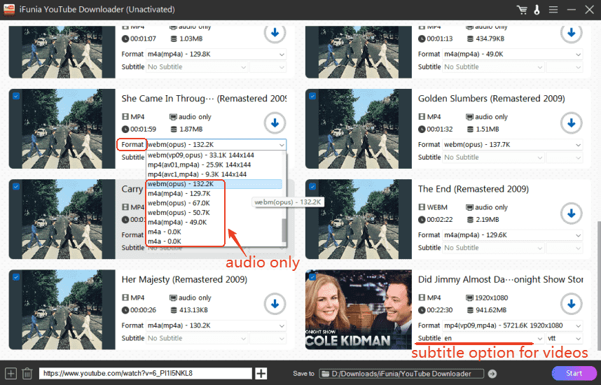 Step 4: Choose a desired output format. To download YouTube to M4A or other formats, expand the Format drop-down list and scroll down to select. The higher the audio bitrate, the better the sound quality. In addition, for videos, there are subtitle options in multiple languages.
