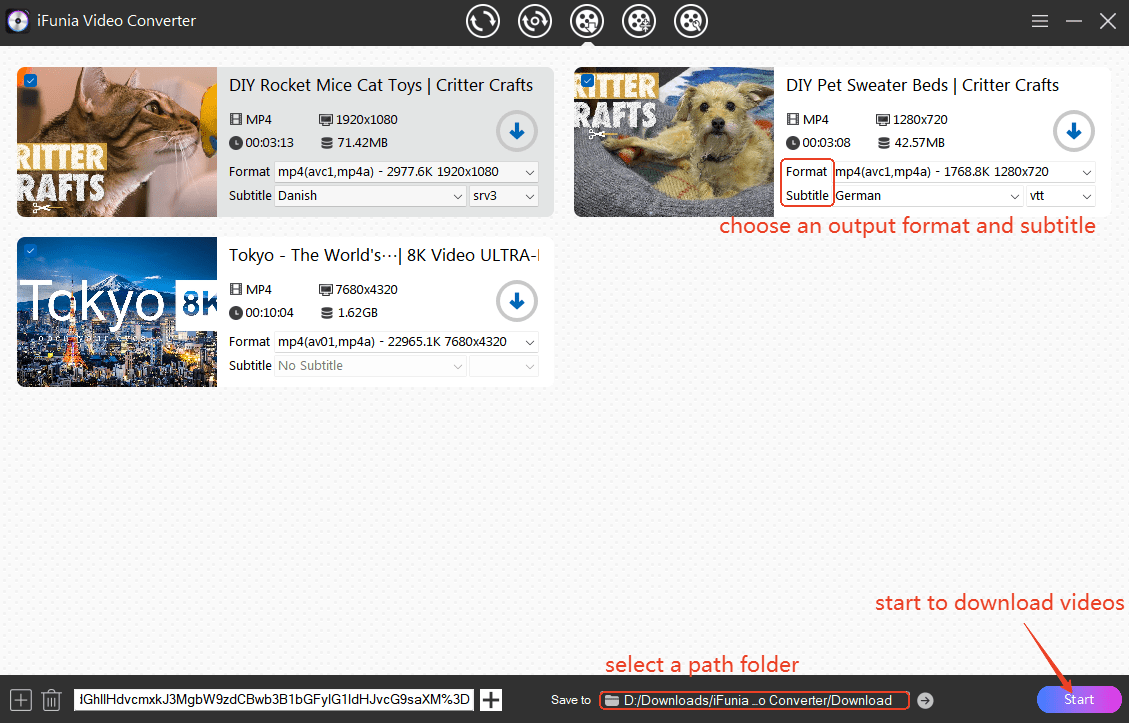 - Choose the output format and a subtitle of the video, define a destination folder, and hit on the Start button.