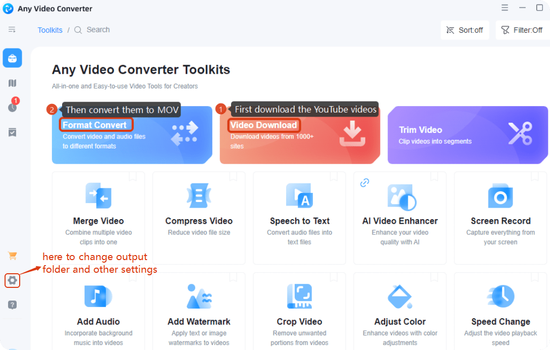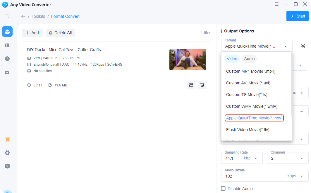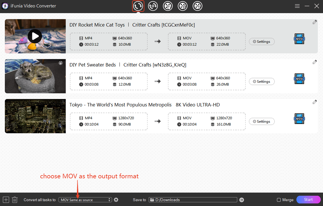 - Once downloaded, go back to the Toolkits and find the Format Convert tool to convert YouTube to MOV. Choose Apple QuickTime Movie as the output format and click Start. Then, you’ll find the videos in the folder you chose.