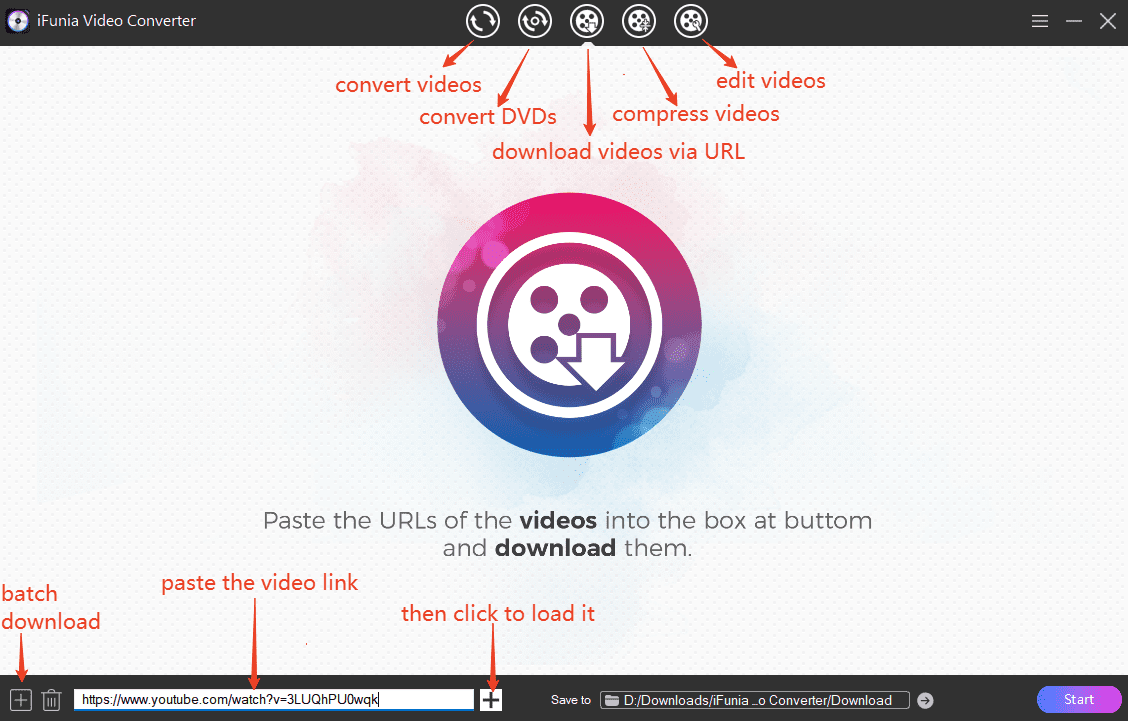 - Go to the third tab from the upper menu and paste the video link into the search box. Then, click the ➕ on the right to load the video into the software. The ➕ on the left is for download in bulk.